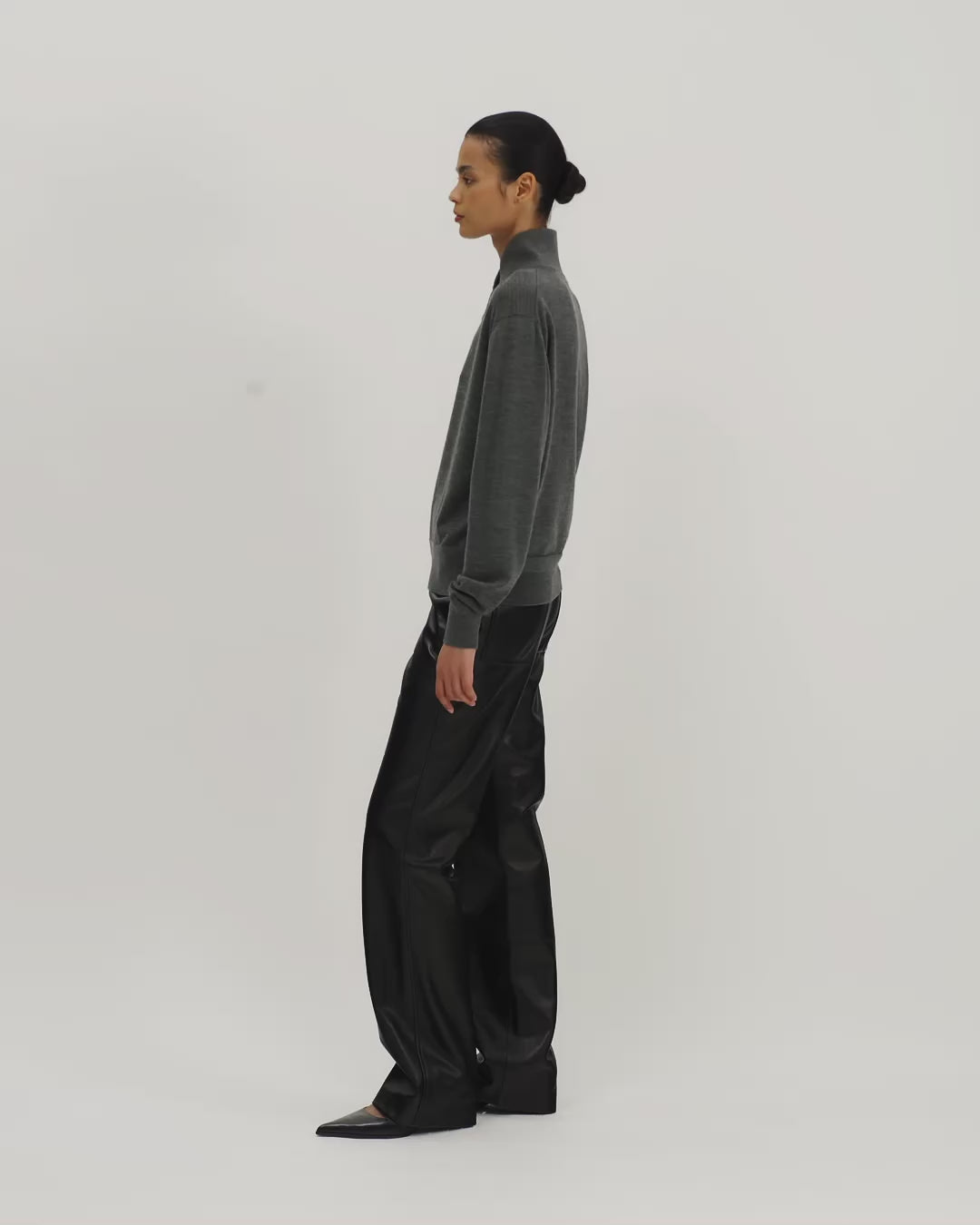 Spun from 100% mid-weight merino wool, this knit draws on the lines of a vintage military uniform design. Defined by racking stitch detailing and horn buttons at the neckline, it introduces a subtle utilitarian sensibility. A study in proportion and purpose—balancing structure with ease for everyday wear.