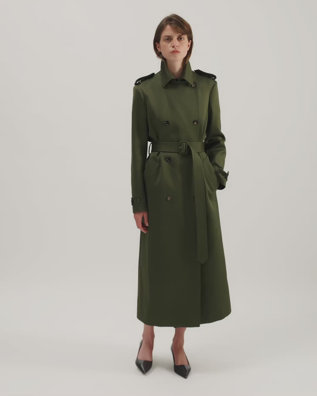 The Amara trench coat follows the grammar of traditional military outerwear, a reference Veronica returns to when working with utility silhouettes. Structured technical cotton was selected for its firm hand and ability to hold line through length and sleeve. The cut is elongated and straight, and it features classic trench elements: collar, fastening, and belt. Wear it as a city shell, replacing jackets or coats with an urban edge.