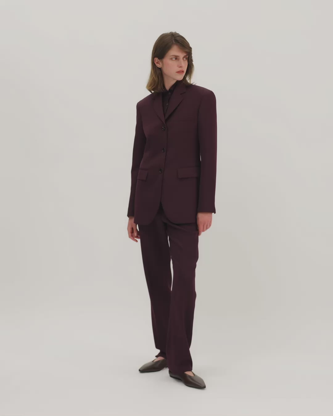The Fini Jacket, crafted in Italy from a structured wool in a deep plum shade, is Veronica's take on the classic blazer. A refined tailored silhouette featuring structured shoulders and flapped welt pockets.