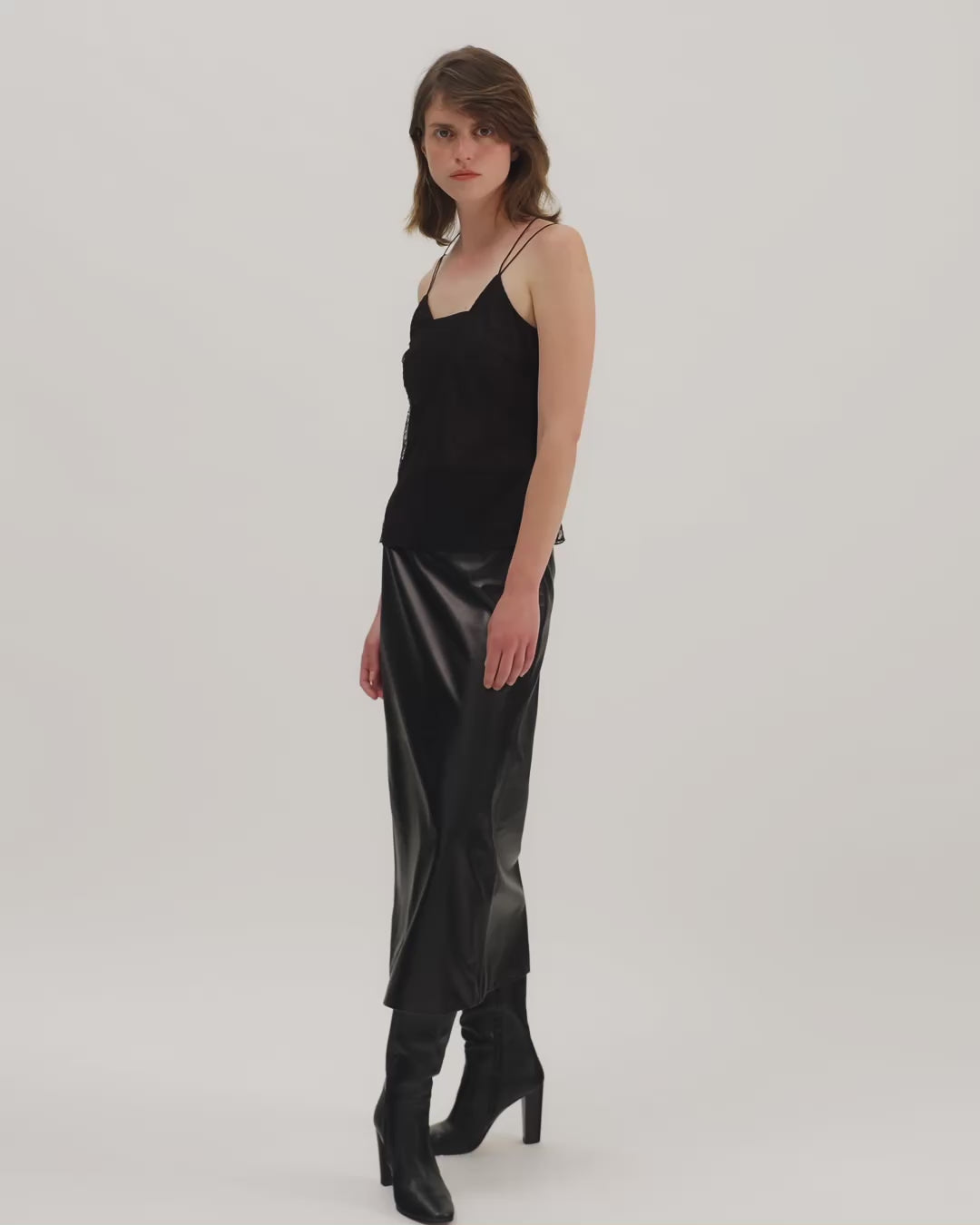 The Gisele Skirt- cut from 100% a soft nappa leather in black, this mid-length style is cut to a slim, straight frame. A high waist, concealed side zip and a discreet side split balance precision with ease, fully lined in stretch silk crepe-de-chine. The silhouette reads as modern tailoring in leather.