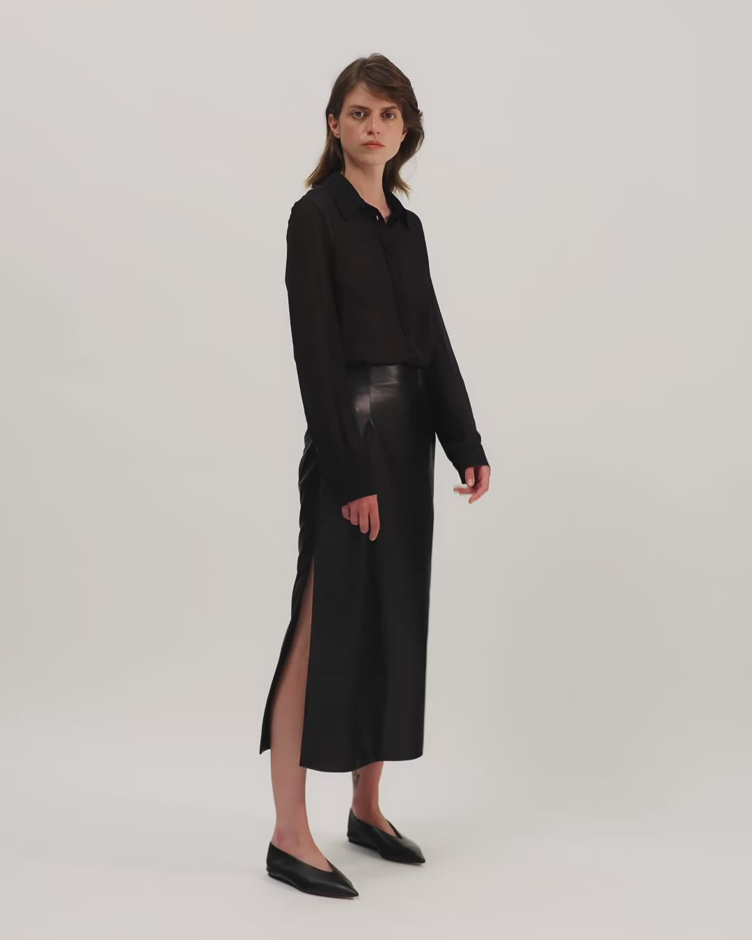 Silk georgette is tailored into a classic shirt silhouette. Generous gathering and refined proportions combine with a clean collar and fluid sleeves, making the Julieta a refined versatile piece.