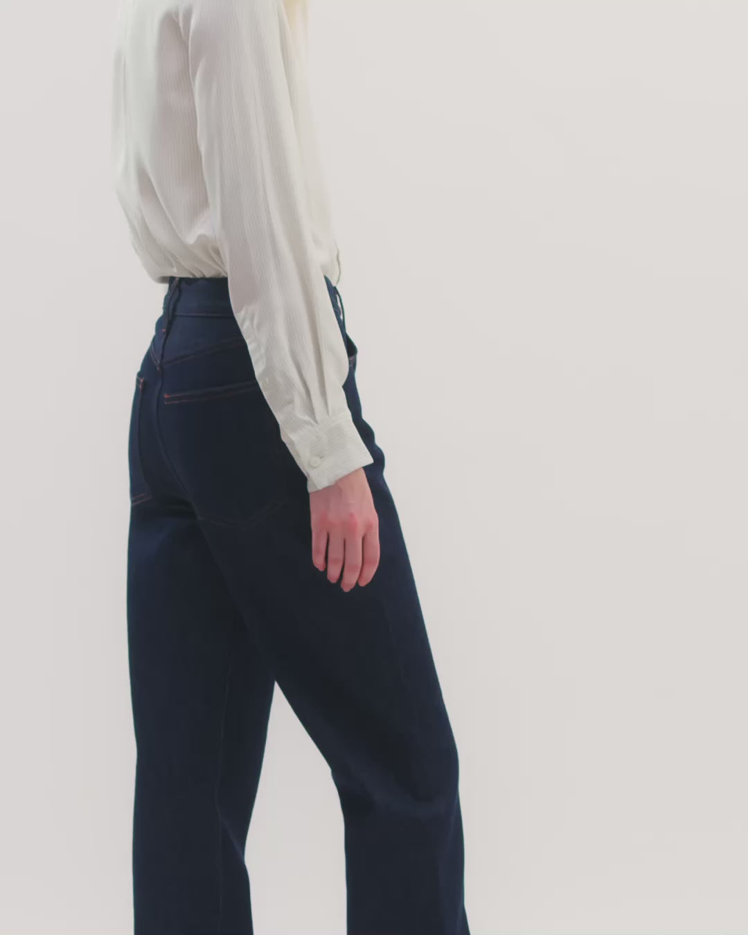 Mildly washed raw denim is crafted to form a slim-straight leg silhouette. It features with a zip-and-button fastening, monogram hardware, and classic front pocketing and back patch pockets to complete the trouser. Versatile, it pairs with the Clea jacket to create a modern, tailored denim look.