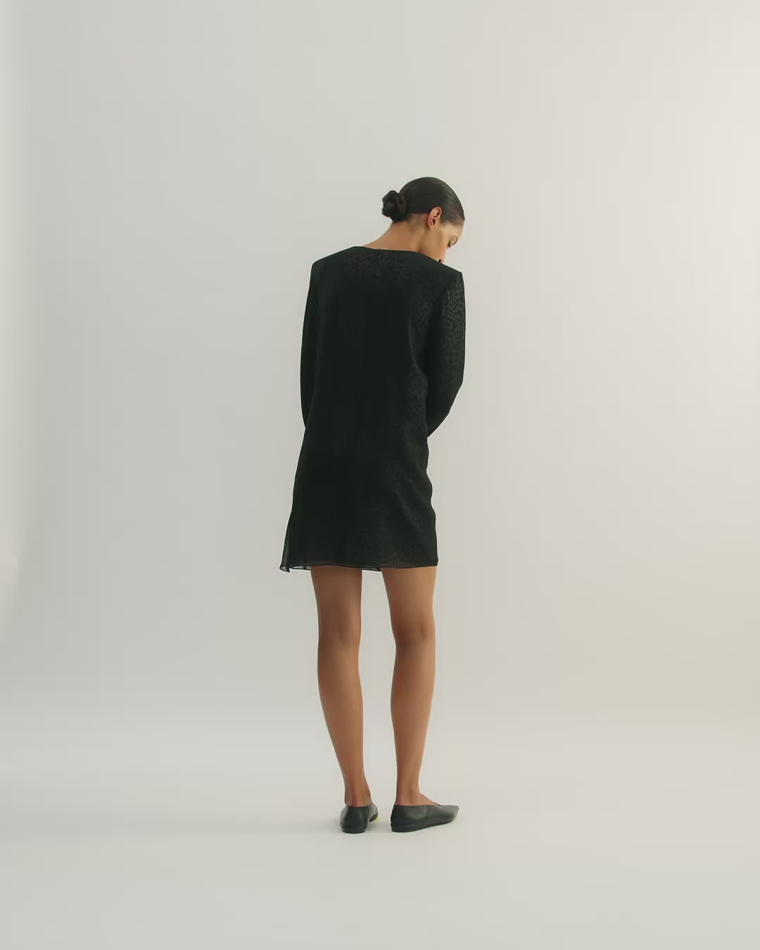 With a rounded neckline and draped godets, the Pia dress is a design of understated elegance. Cut from silk in a dark metallic foil leopard motif, featuring a centre-back zip and small covered shoulder and side drapes for an elevated finish.